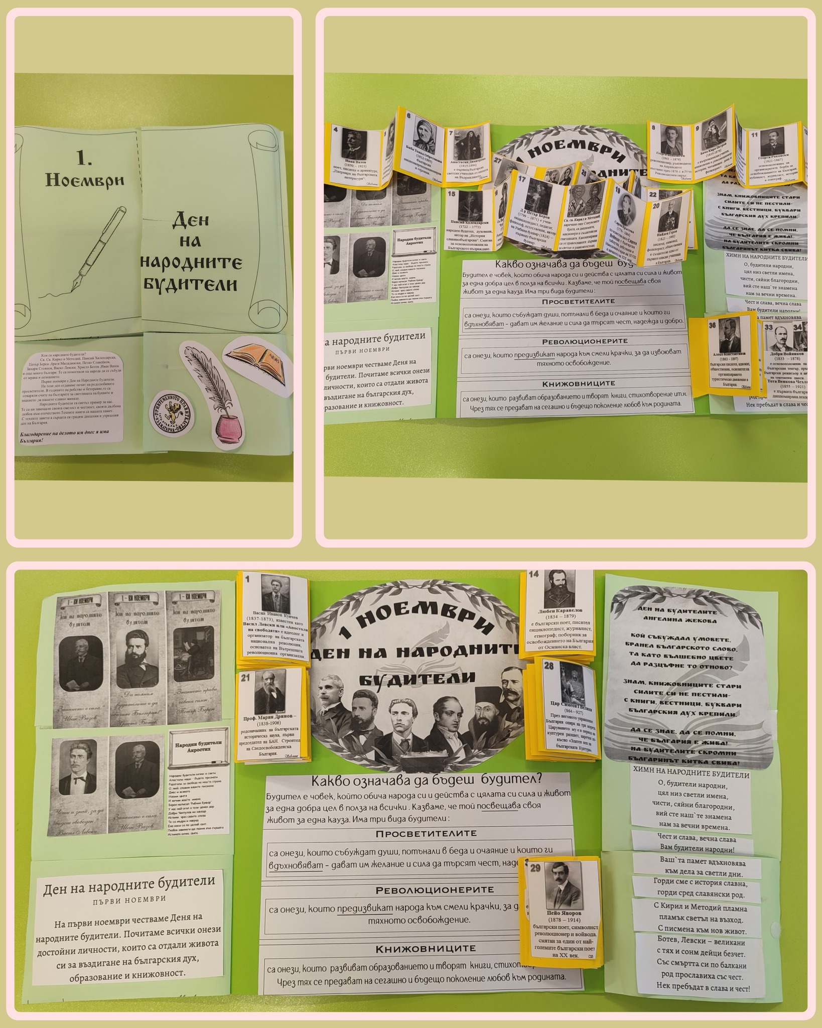Учениците от I в клас (екип Елена Василева и Ирина Тодорова) създадоха детайлни табла и впечатляващ 3D макет на будителите.