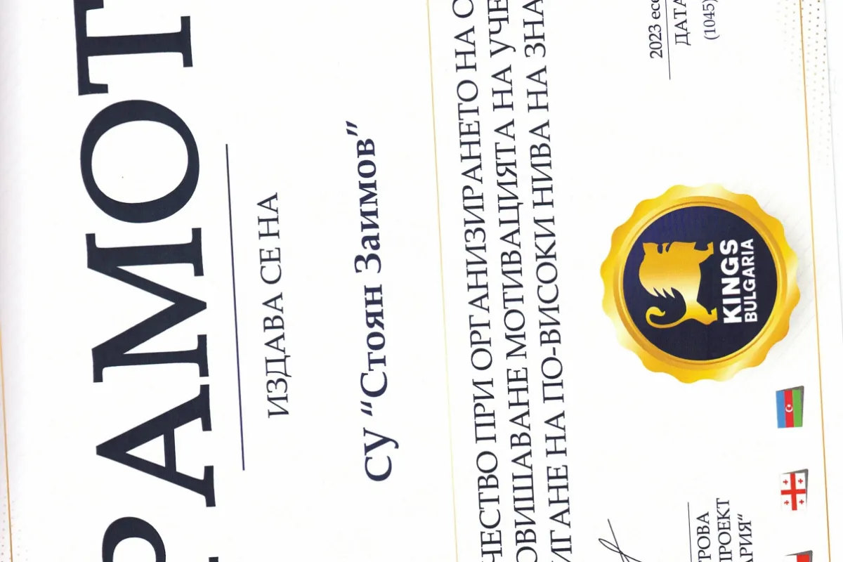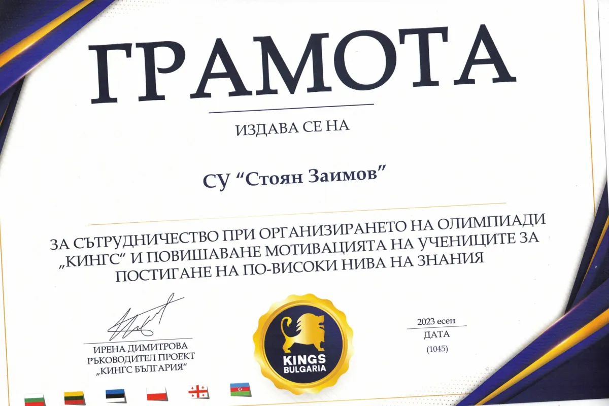 Участието на заимовци в Международната олимпиада “КИНГС”, есен 2023, по английски език, е отлично. Доказателство за това са дипломите, които получиха училището, учителите и учениците.