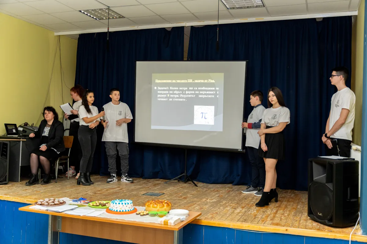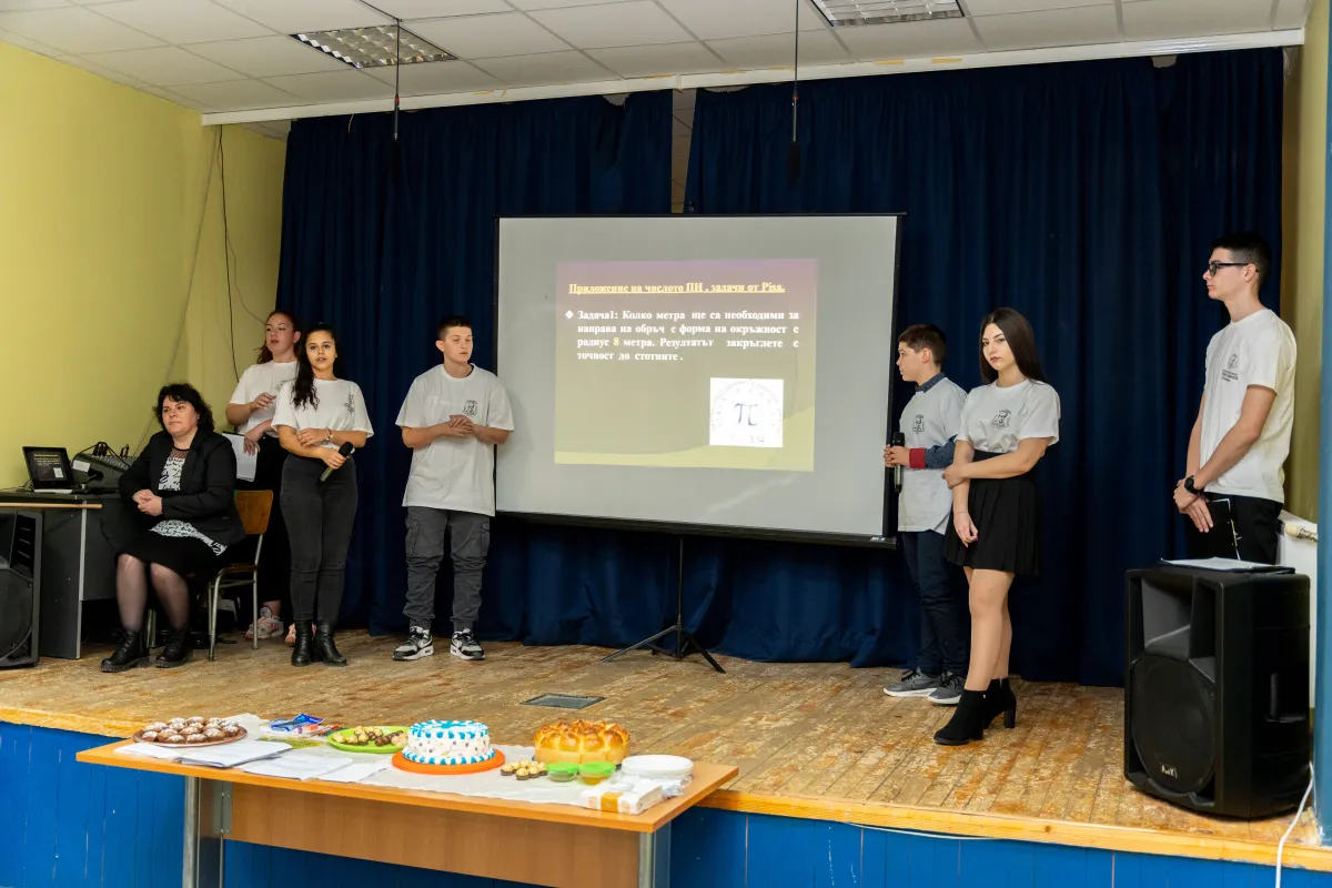 Ученици от клубовете по математика "Архимед - ентусиазирани математици" и "Забавна математика" показаха интересната и полезната математика. Освен любопитни факти за числото Пи, интерес предизвикаха задачи към публиката, насочени към приложението на знанията. Във викторината участваха всички в залата. Подарък в края на тържеството беше тортата на числото Пи.