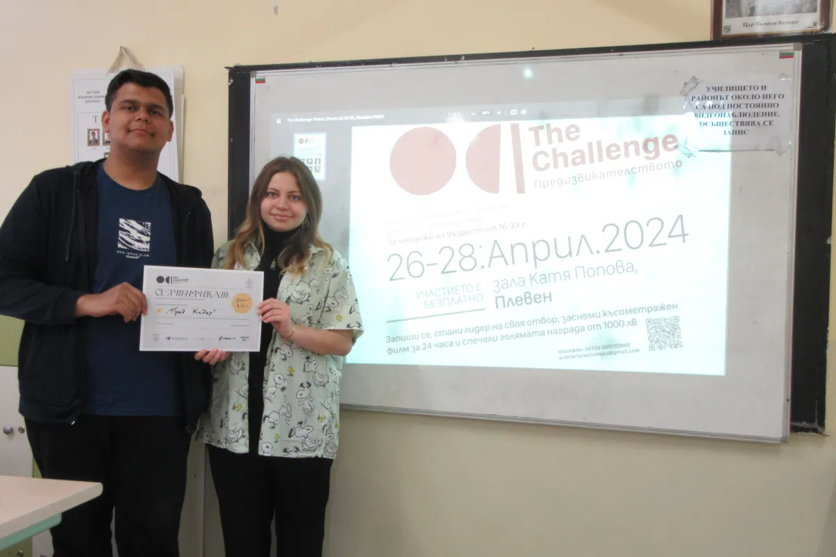 С гордост и радост съобщаваме, че Полина Динчева и Валентин Мончев, ученици от XIIб клас на СУ „Стоян Заимов“- град Плевен се класираха на първо място в пилотното издание на кино проекта „Предизвикателството 2024“. Техният отбор „Пред кадър“ заслужено грабна приза за най-добър късометражен филм с оригинална идея и изпълнение. На второ място се класира отборът на още един наш ученик- Павел Илиев от IXа клас. В надпреварата със свои авторски филми се представиха и други наши възпитаници- Николай Грънчаров от XIа клас, Владимир Каменов- VIIIа клас, Габриела Николова- VIIIб клас, Николета Янкова- VIIIа клас и Мариела Тинчева - VIIIа клас. На младите творци пожелаваме нови творчески предизвикателства и постижения в кино изкуството!