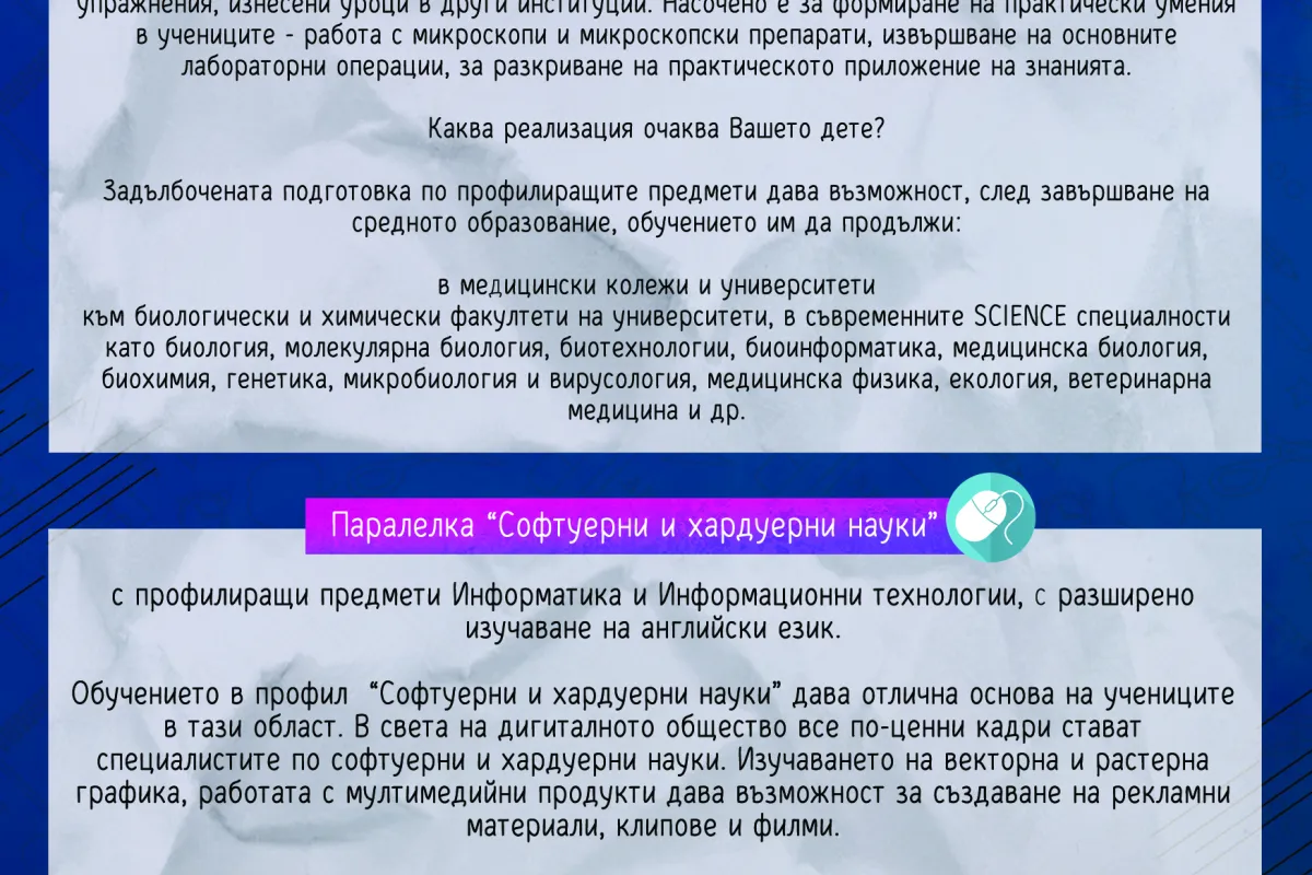 В приложеният файл е пълната информация за приема след основно образование в VIII клас - за учебната 2024/ 2025 година, а именно: