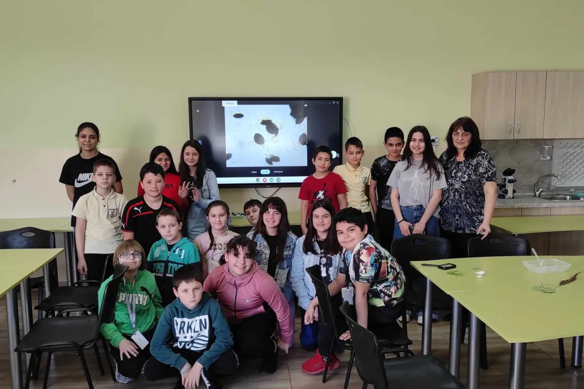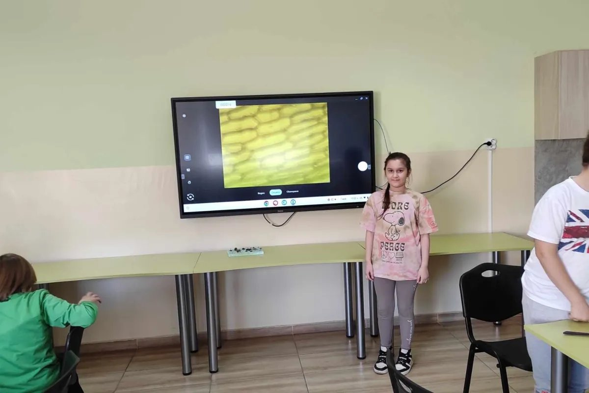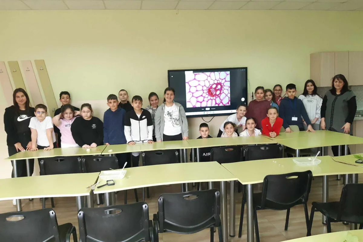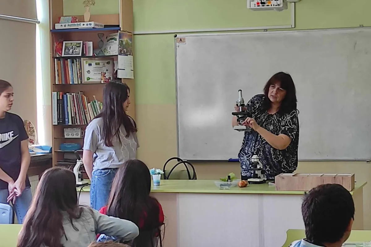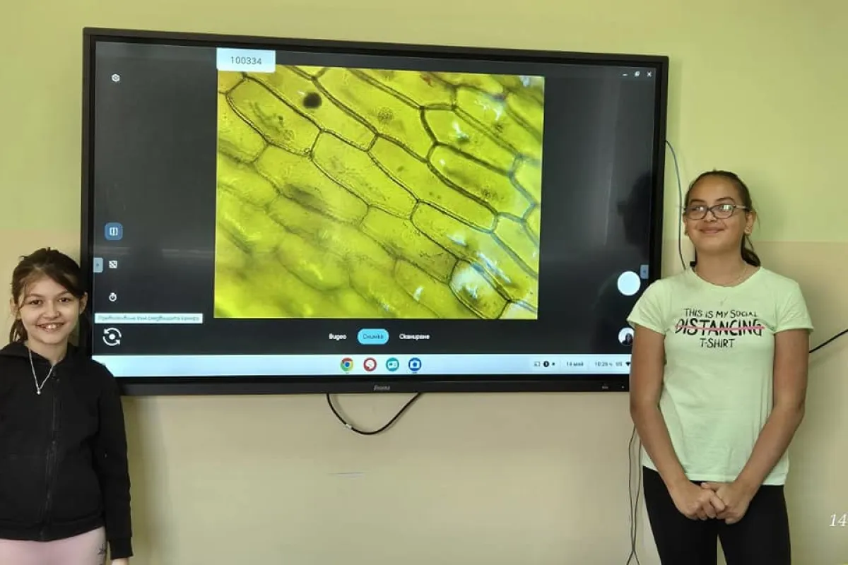 На 14 май 2024 г. г-жа Поля Николова Попминчева беше учител на учениците от четвърти клас. Като биолог тя показа интересната страна на науката, а именно експериментите. Лабораторният урок, проведен в кабинета по биология предизвика вниманието на четвъртокласниците. Учениците се запознаха с увеличителните уреди - лупа и микроскоп, научиха се да правят нетрайни микроскопски препарати и да фокусират до получаване на ясен образ. Видяха растителни клетки от ципа на лук, устица и трихоми от долната повърхност на лист от мушкато, тичинков прашец и зародиш от бобово семе. Още по - интересно им стана, когато успяха да проектират образа на наблюдаваното върху тъч екрана, благодарение на това, че микроскопите са дигитални и при свързване с Хромбук (училището работи по модела 1: 1 и е Google Reference) може да визуализират наблюдаваното на екрана.