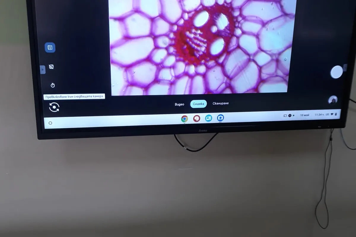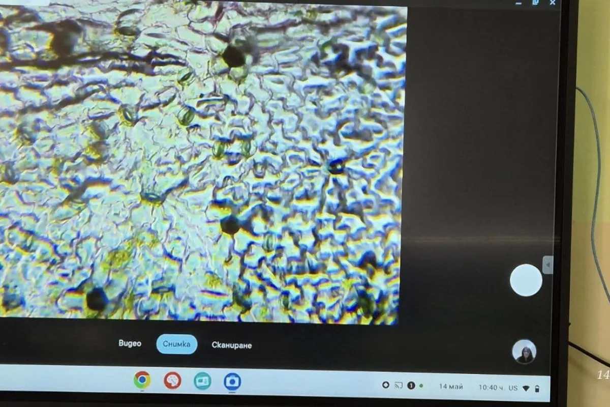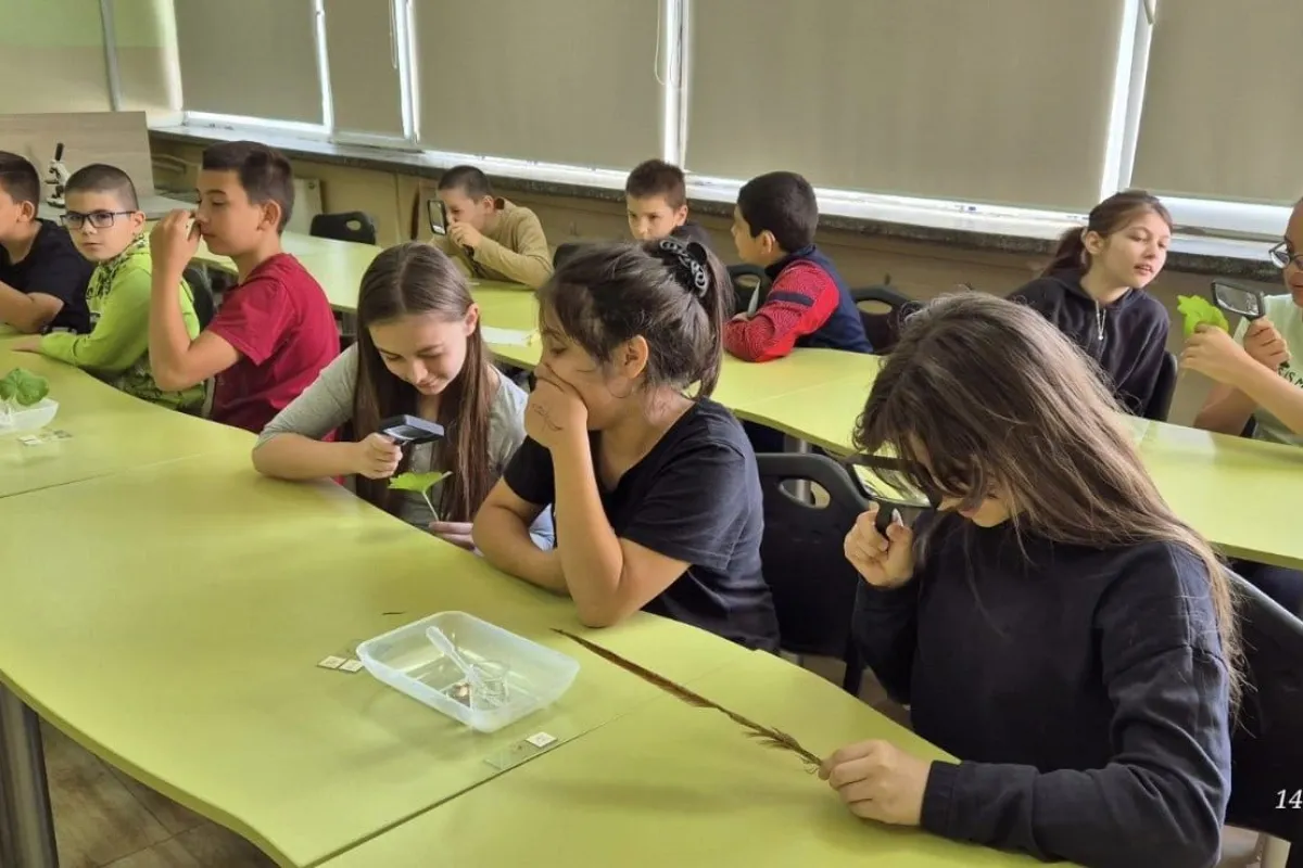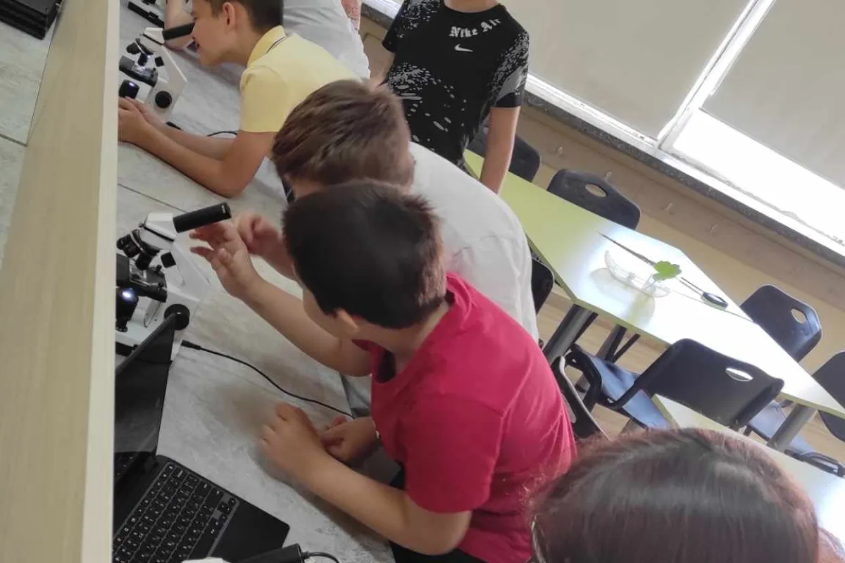 На 14 май 2024 г. г-жа Поля Николова Попминчева беше учител на учениците от четвърти клас. Като биолог тя показа интересната страна на науката, а именно експериментите. Лабораторният урок, проведен в кабинета по биология предизвика вниманието на четвъртокласниците. Учениците се запознаха с увеличителните уреди - лупа и микроскоп, научиха се да правят нетрайни микроскопски препарати и да фокусират до получаване на ясен образ. Видяха растителни клетки от ципа на лук, устица и трихоми от долната повърхност на лист от мушкато, тичинков прашец и зародиш от бобово семе. Още по - интересно им стана, когато успяха да проектират образа на наблюдаваното върху тъч екрана, благодарение на това, че микроскопите са дигитални и при свързване с Хромбук (училището работи по модела 1: 1 и е Google Reference) може да визуализират наблюдаваното на екрана.