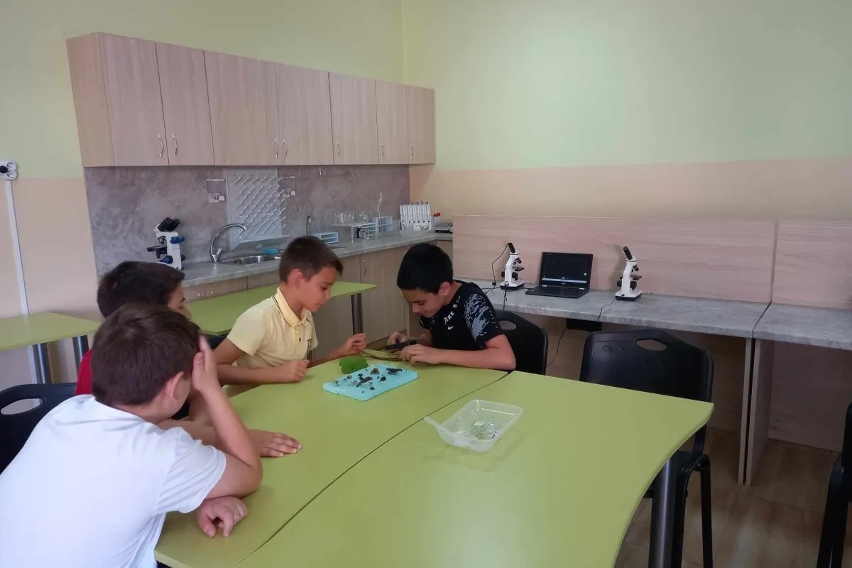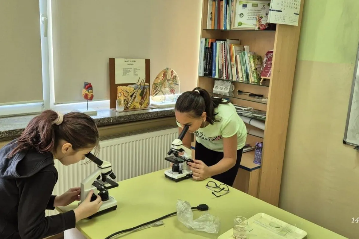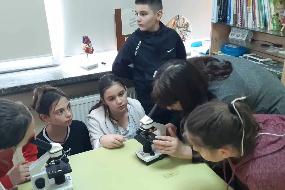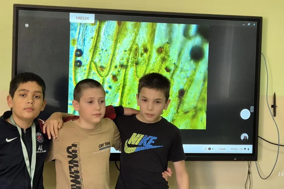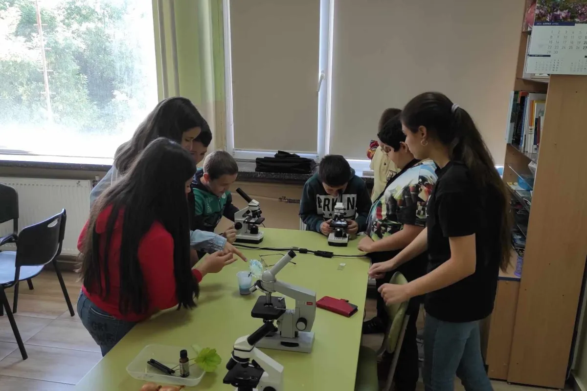 На 14 май 2024 г. г-жа Поля Николова Попминчева беше учител на учениците от четвърти клас. Като биолог тя показа интересната страна на науката, а именно експериментите. Лабораторният урок, проведен в кабинета по биология предизвика вниманието на четвъртокласниците. Учениците се запознаха с увеличителните уреди - лупа и микроскоп, научиха се да правят нетрайни микроскопски препарати и да фокусират до получаване на ясен образ. Видяха растителни клетки от ципа на лук, устица и трихоми от долната повърхност на лист от мушкато, тичинков прашец и зародиш от бобово семе. Още по - интересно им стана, когато успяха да проектират образа на наблюдаваното върху тъч екрана, благодарение на това, че микроскопите са дигитални и при свързване с Хромбук (училището работи по модела 1: 1 и е Google Reference) може да визуализират наблюдаваното на екрана.