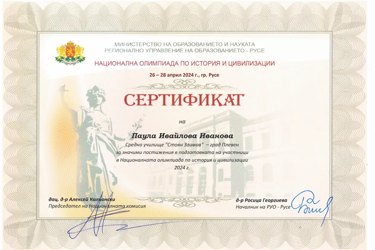 Магдалена Йосифова от VII клас на СУ “Стоян Заимов” - град Плевен е единствената участничка от област Плевен в Националния кръг на олимпиадата по История и цивилизации и е с отлична оценка!