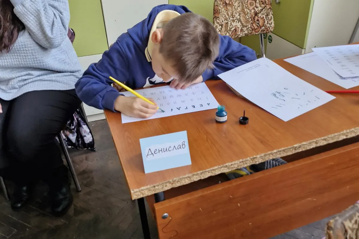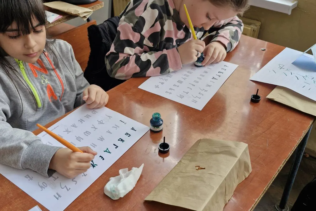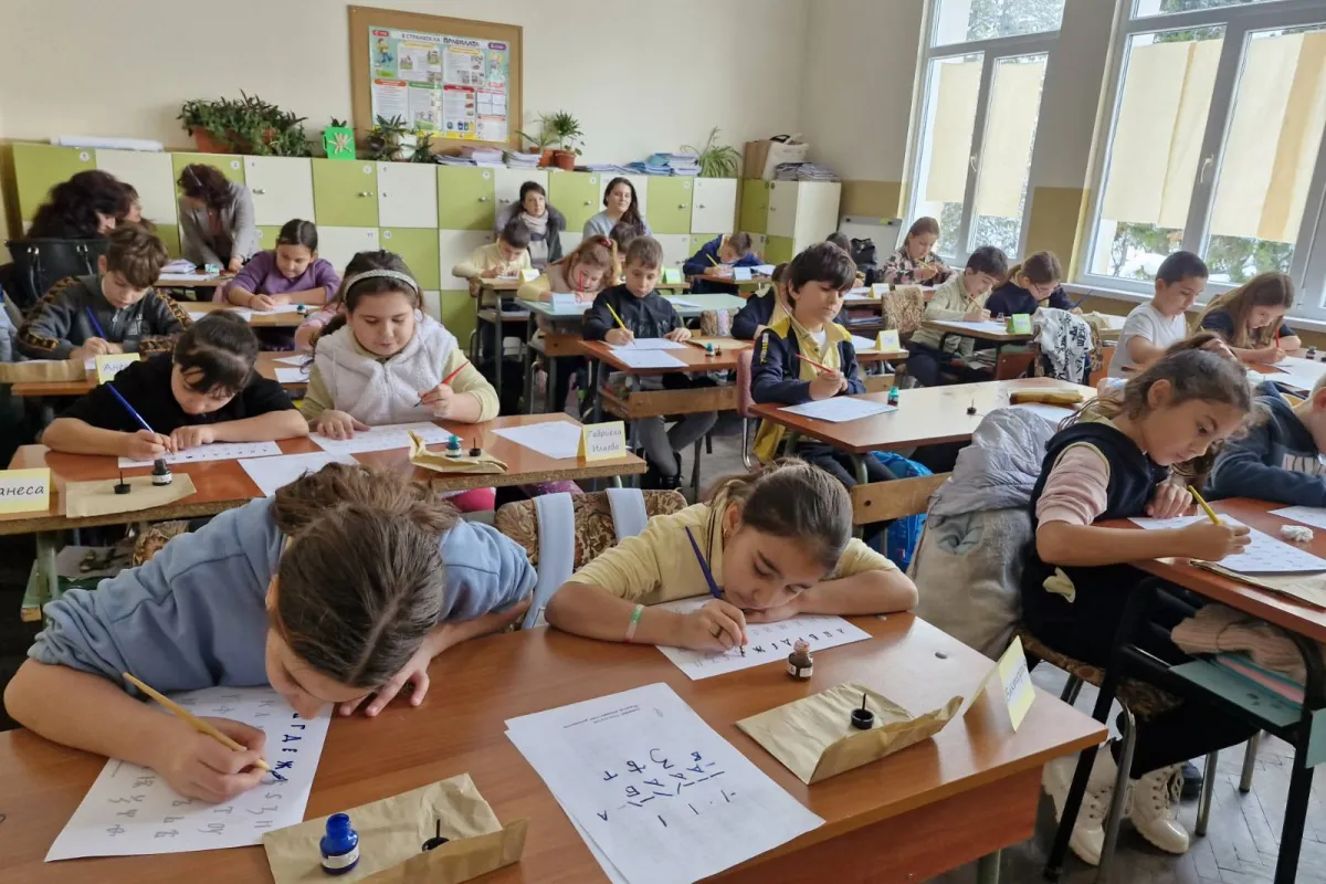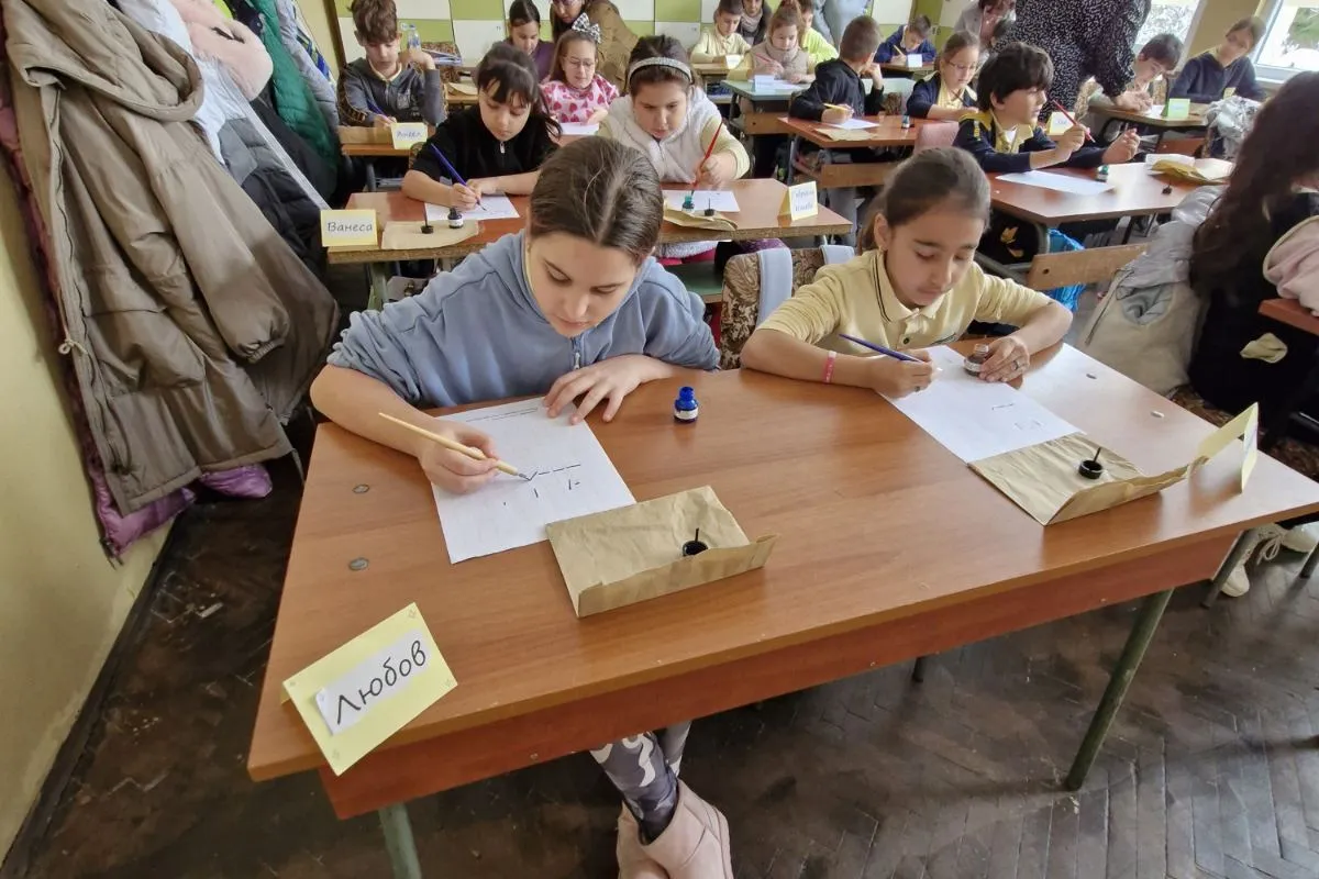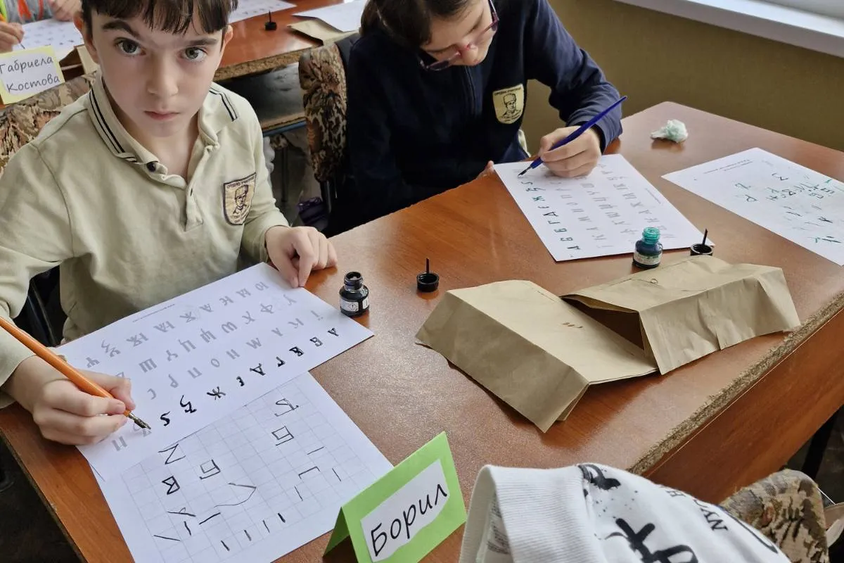 Всеки ученик получи перодръжка и мастилничка. С усърдие писаха букви от старобългарската азбука.