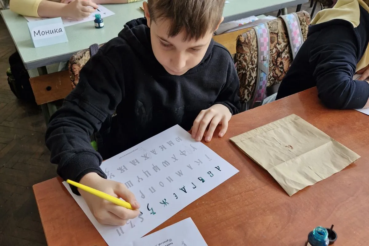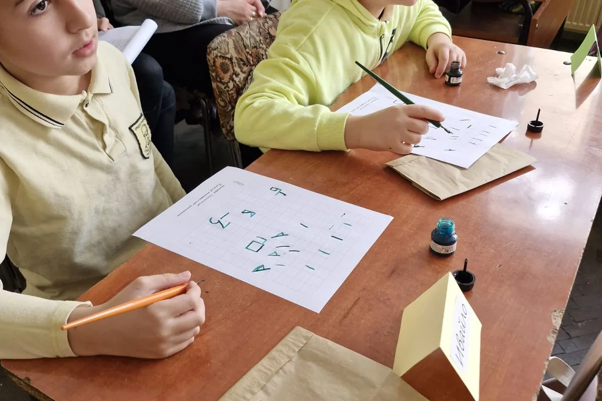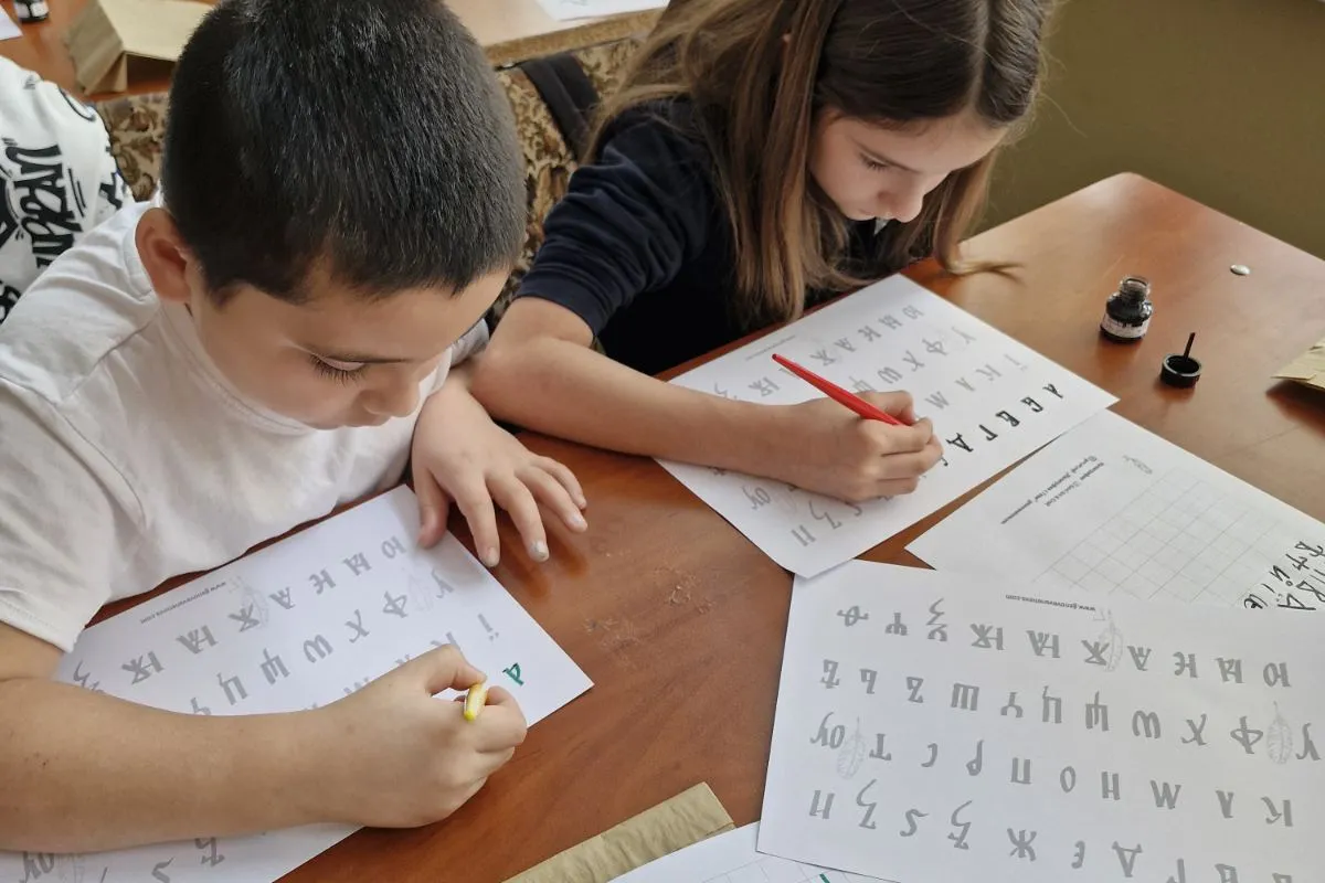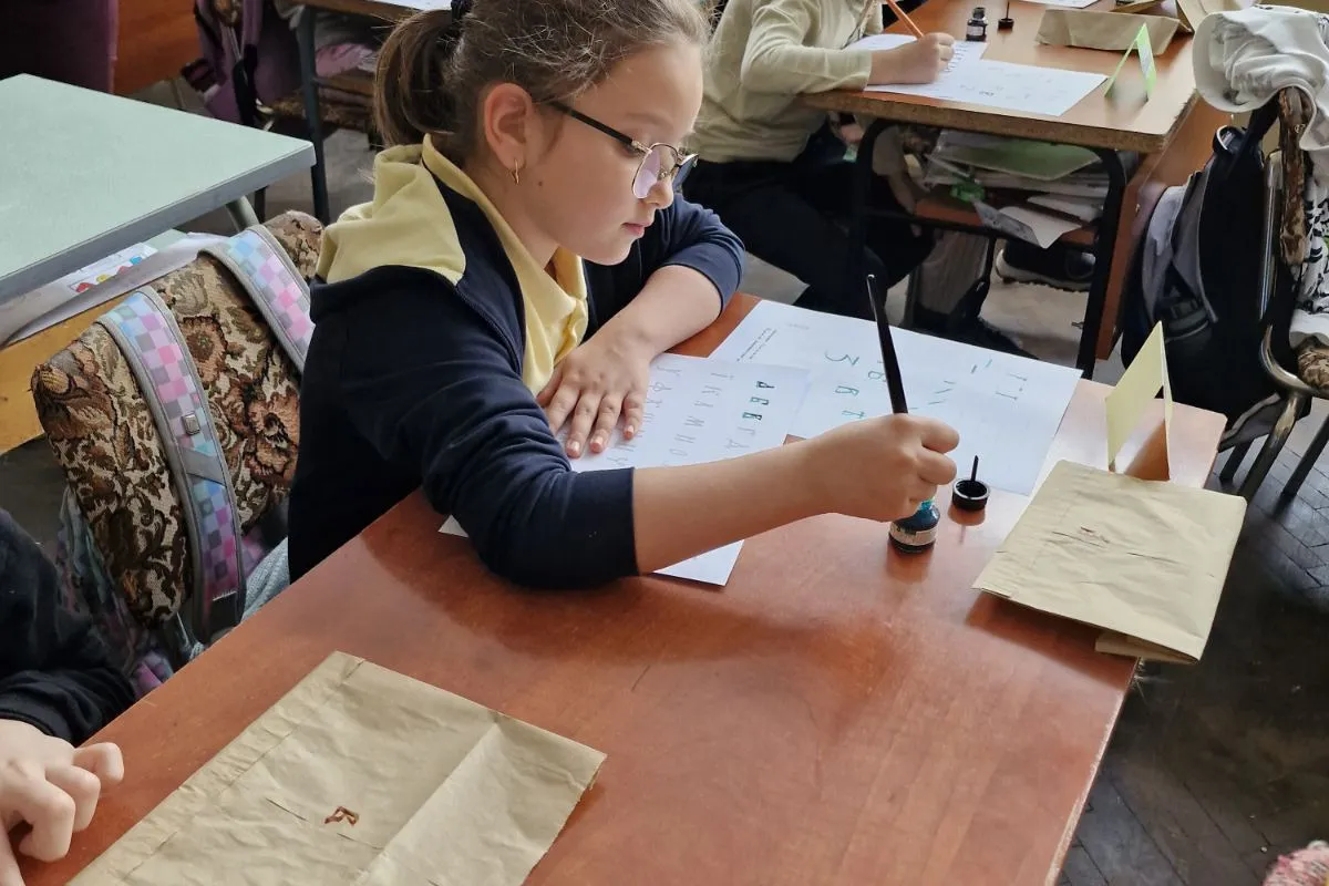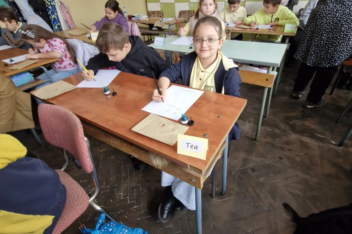 Всеки ученик получи перодръжка и мастилничка. С усърдие писаха букви от старобългарската азбука.
