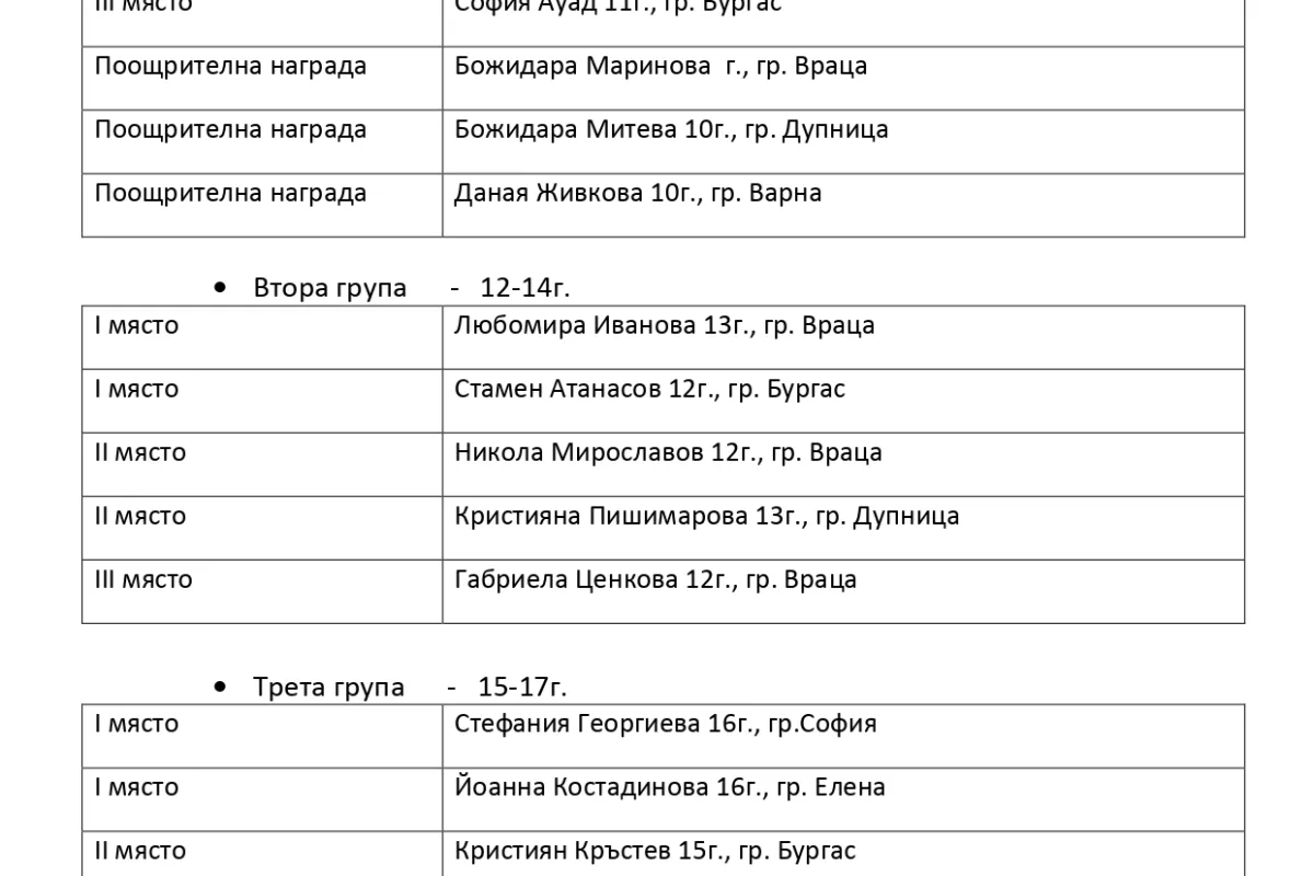 Габриела Цолова, ученичка в VIIIб клас (профил “Природни науки”) е победителка в раздел “Приложно изкуство”, втора група на Осмия Национален конкурс “Нарисувай историята”, организиран от Младежки дом - Враца.