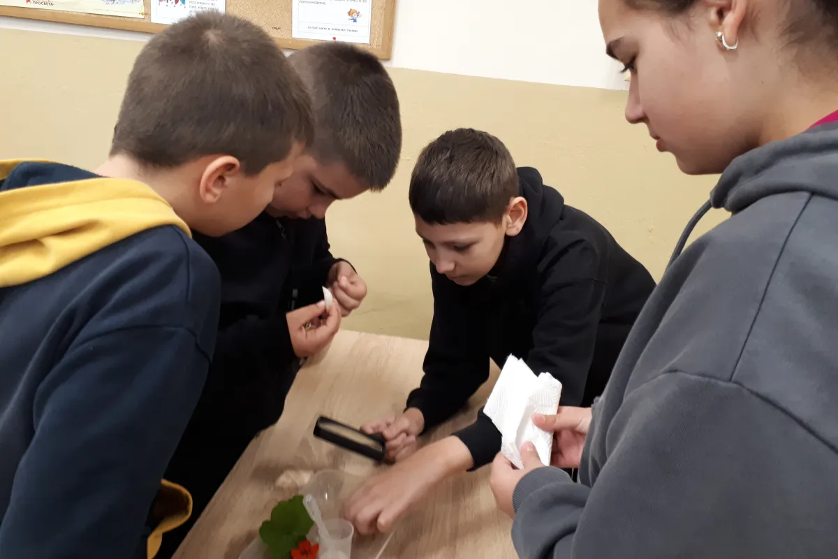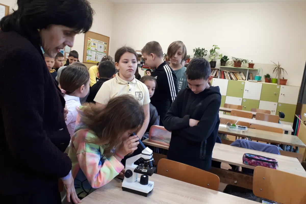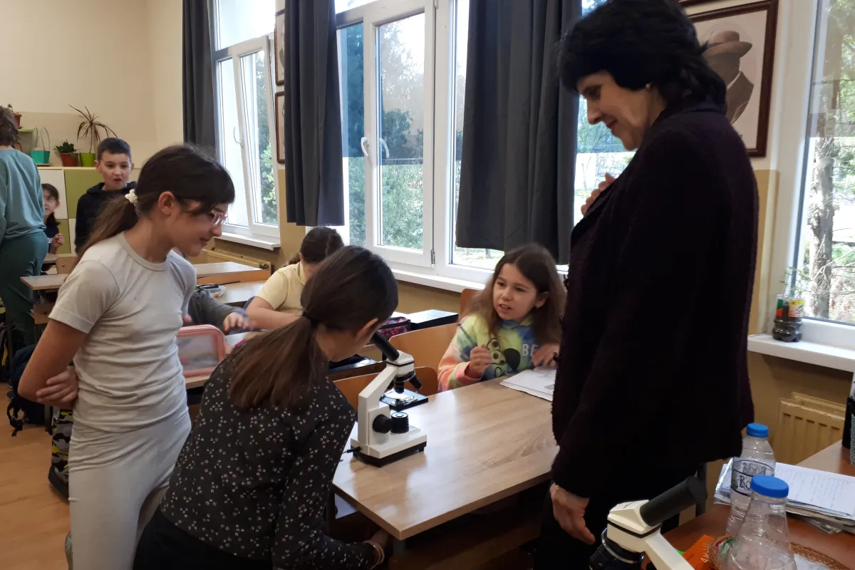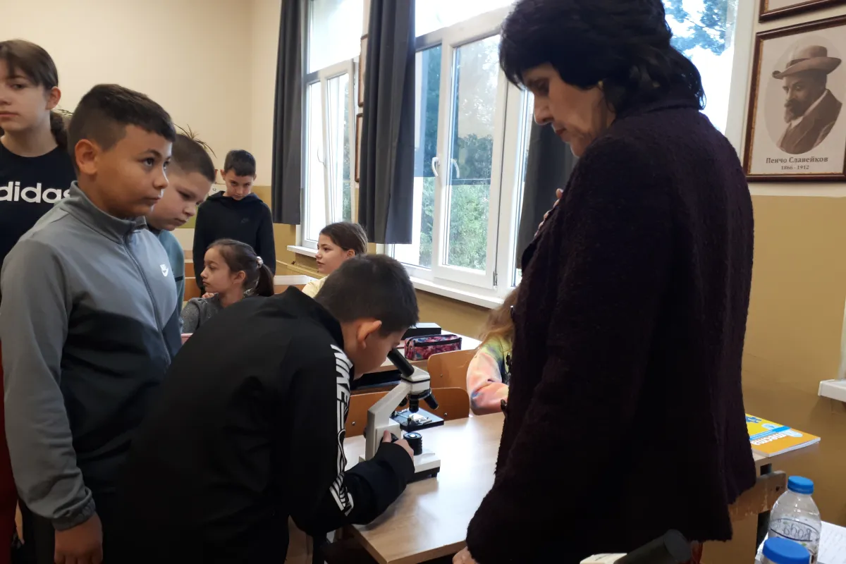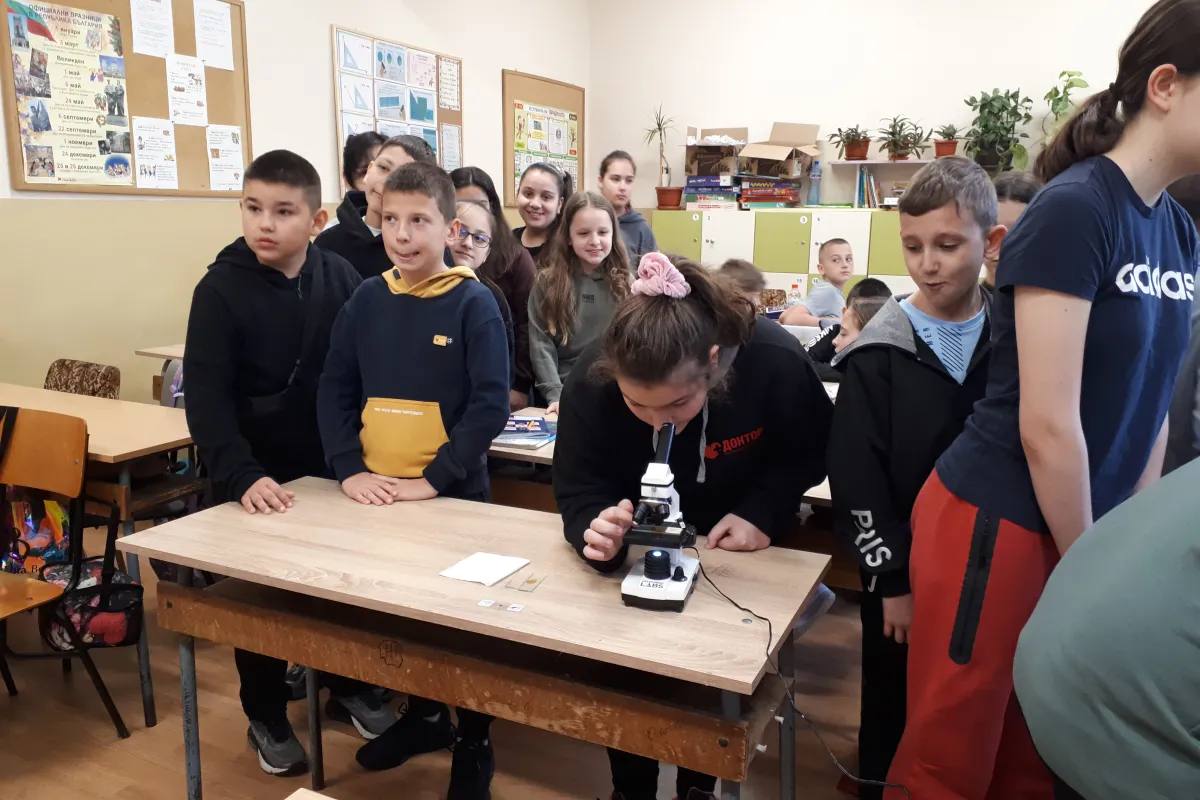 Заедно с г-жа Поля Попминчева (учител в прогимназиален етап) и г-жа Зорка Ненчева (учител в прогимназиален етап), момичетата и момчетата наблюдаваха растителни клетки с увеличителни уреди - лупа и микроскоп.