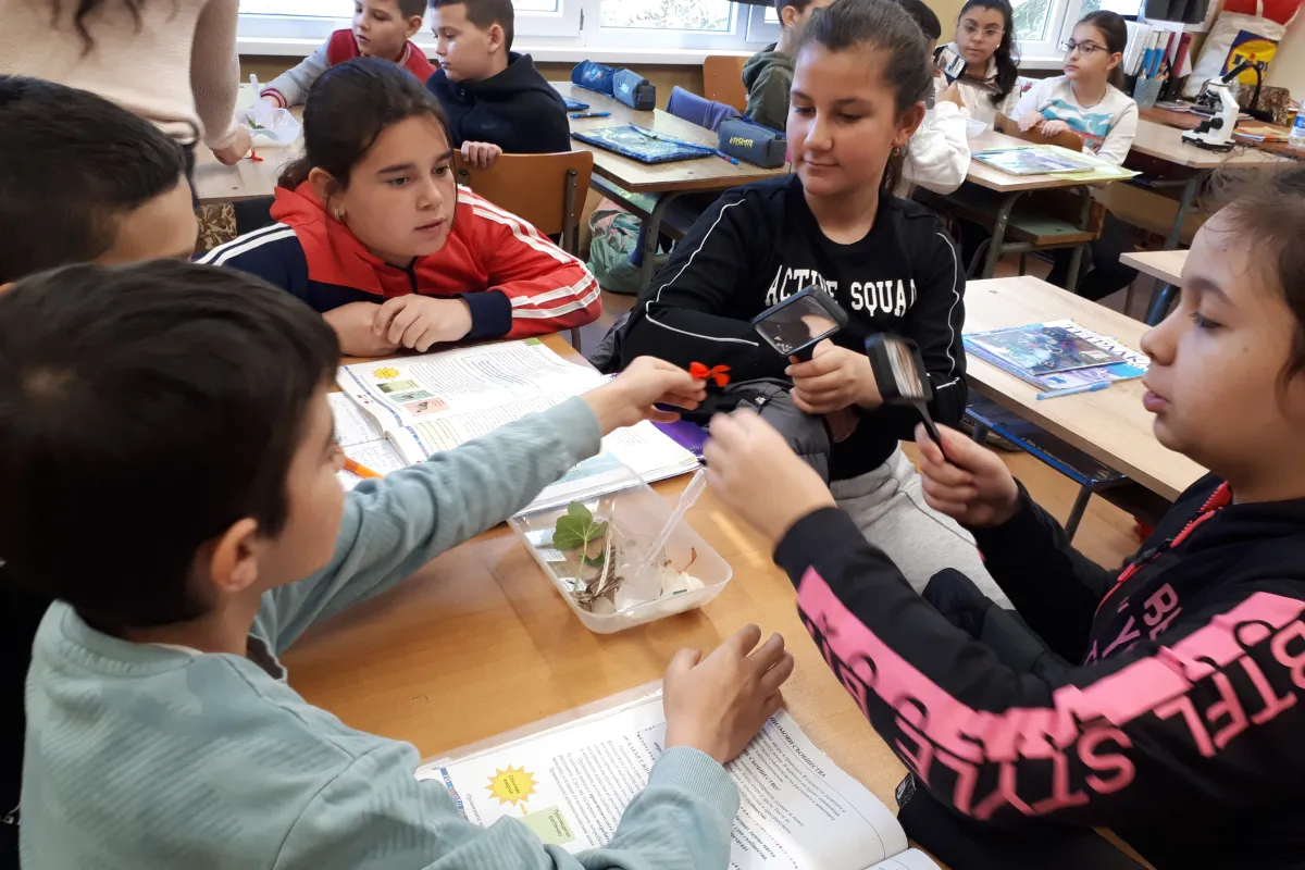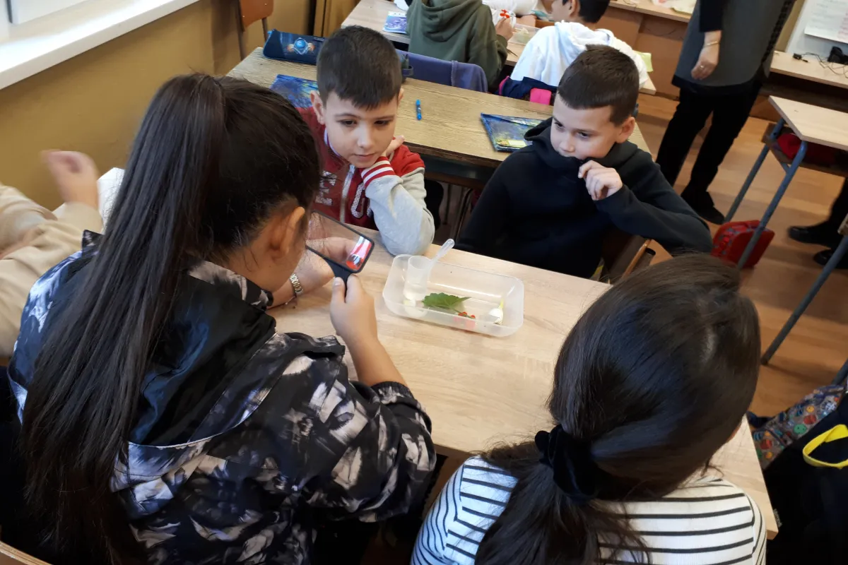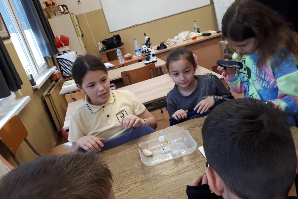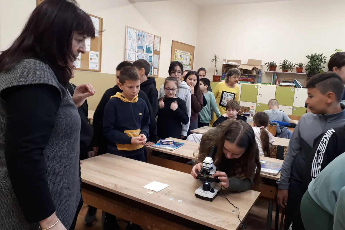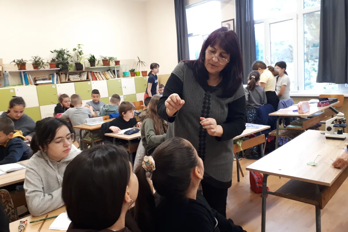 Заедно с г-жа Поля Попминчева (учител в прогимназиален етап) и г-жа Зорка Ненчева (учител в прогимназиален етап), момичетата и момчетата наблюдаваха растителни клетки с увеличителни уреди - лупа и микроскоп.