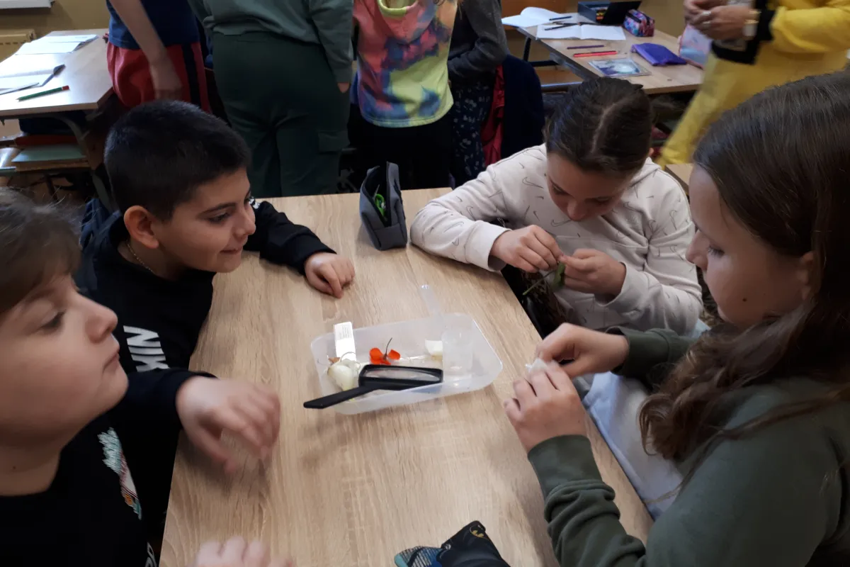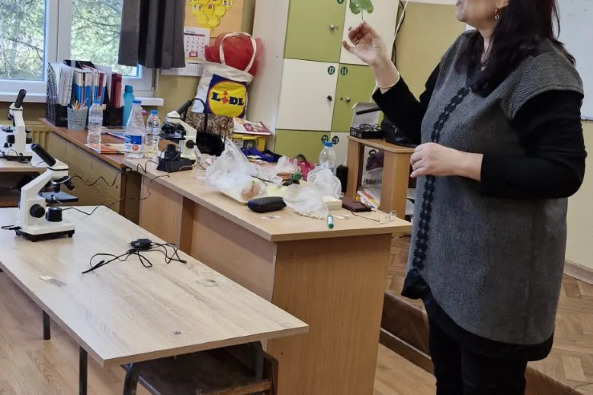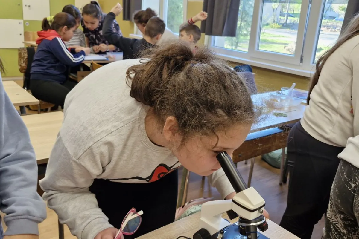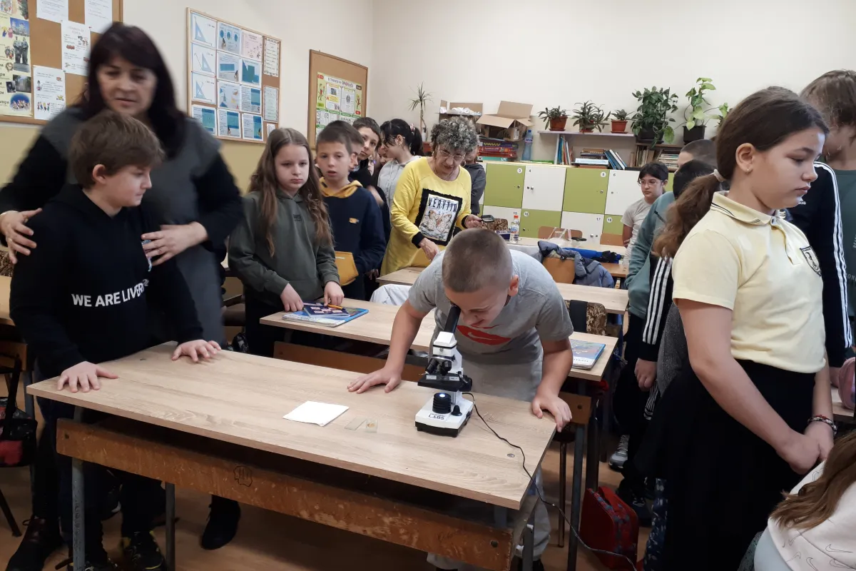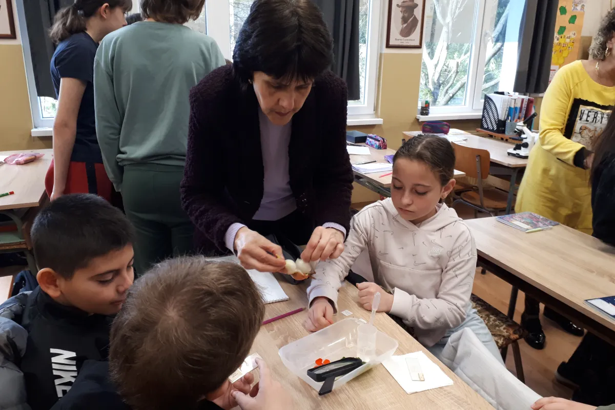 Заедно с г-жа Поля Попминчева (учител в прогимназиален етап) и г-жа Зорка Ненчева (учител в прогимназиален етап), момичетата и момчетата наблюдаваха растителни клетки с увеличителни уреди - лупа и микроскоп.