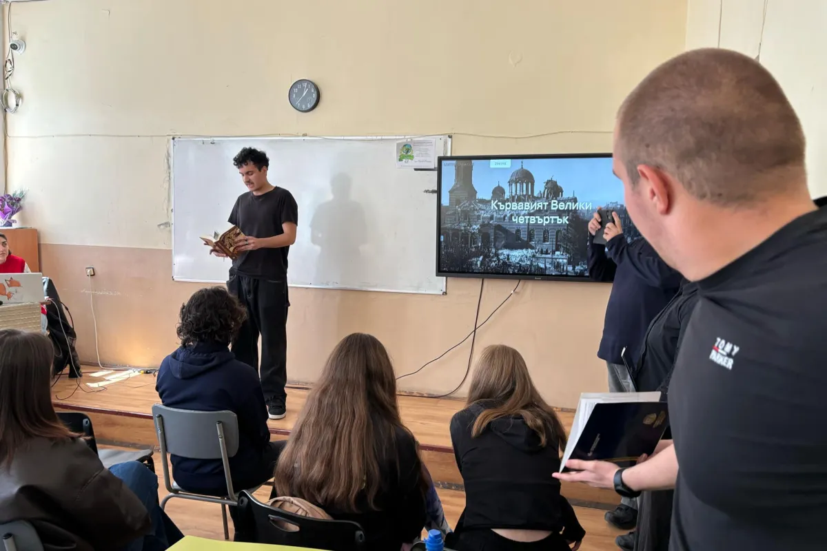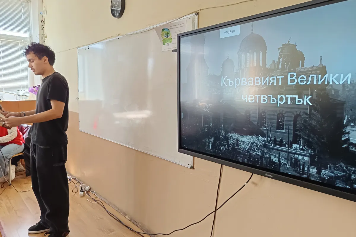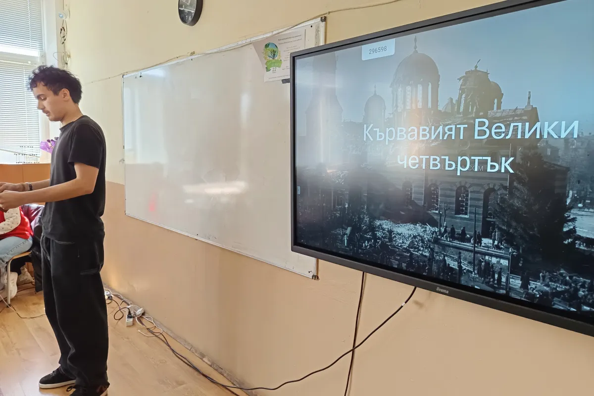 Учениците от клуб "Завет" при СУ "Стоян Заимов" - град Плевен проведоха урок пред съучениците си от VIII, IX и XI клас, на тема "Кървавият Велики четвъртък".