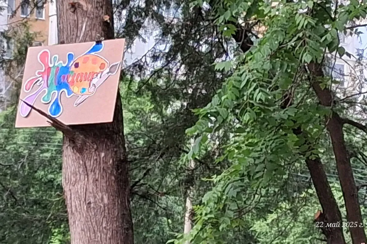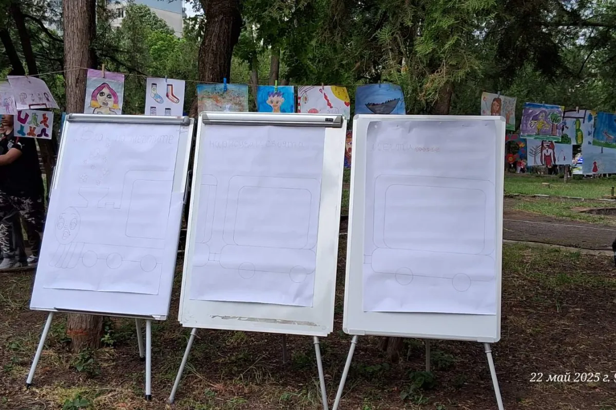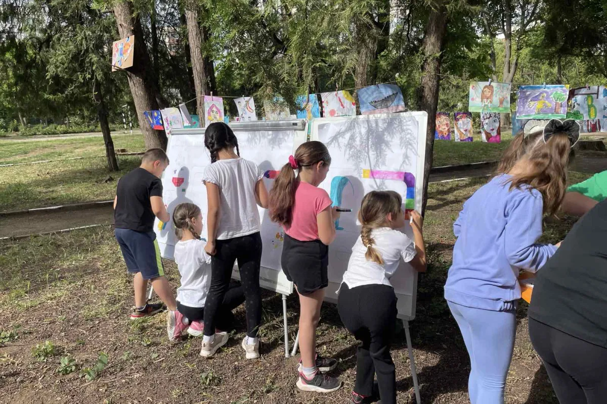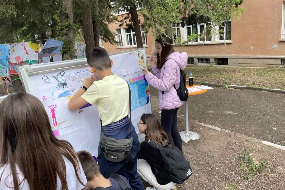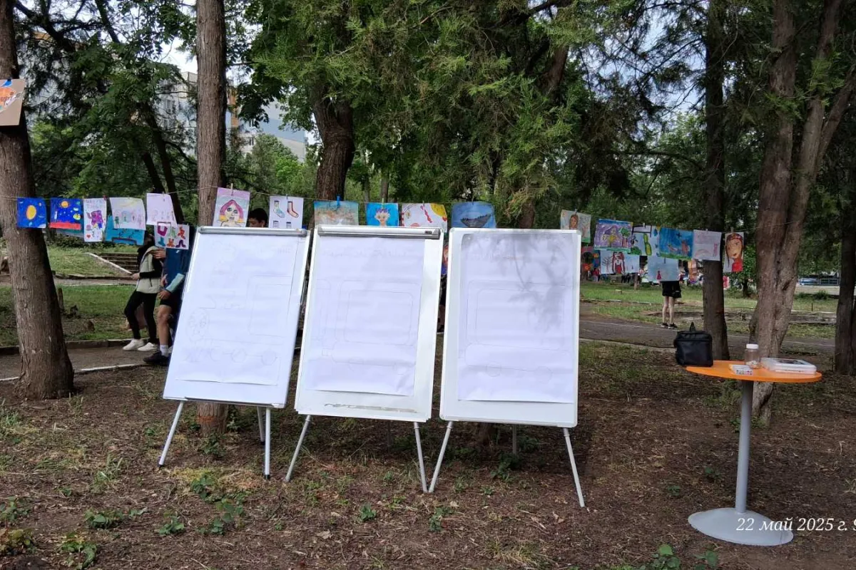 Снимки от изнесена на открито изложба на клуб,,Палитра" и стативи с листове за рисуване на тема ,,Влак на мечтите - нарисувай своята мечта,".