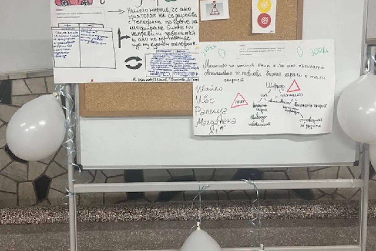 Гимназистите: Изборът е лична отговорност В час на класа учениците от 11. А клас преминаха през предизвикателен социален експеримент на тема „Аз и пътят: Отговорност и избор“. Учениците Маги, Рали, Иво и Ивайло участваха в симулационна игра: те трябваше да преминат през стаята, докато едновременно четат съобщение, говорят по телефона и отговарят на въпроси. Резултатът беше категоричен – всички осъзнаха, че разсейването е опасно, а шофирането е не само свобода, но и огромна отговорност.