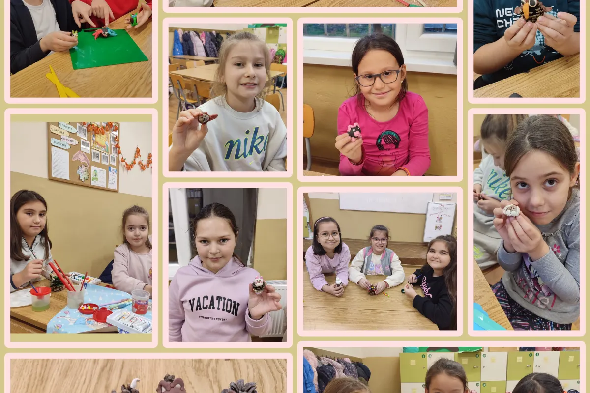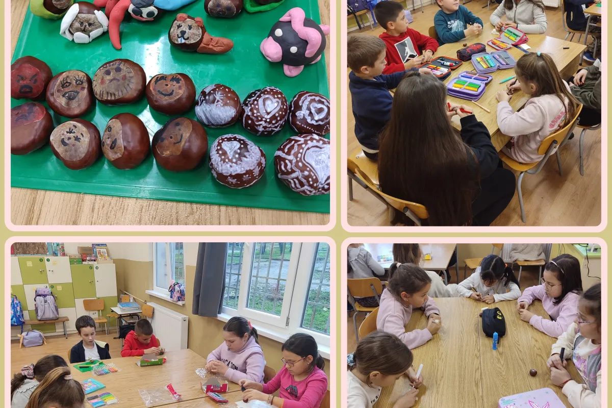 В клуб „Занимания по интереси“ учениците от 2.а работиха с есенни природни материали — кестени и шишарки — и създадоха впечатляващи творби, развивайки въображение, наблюдателност и фината моторика.